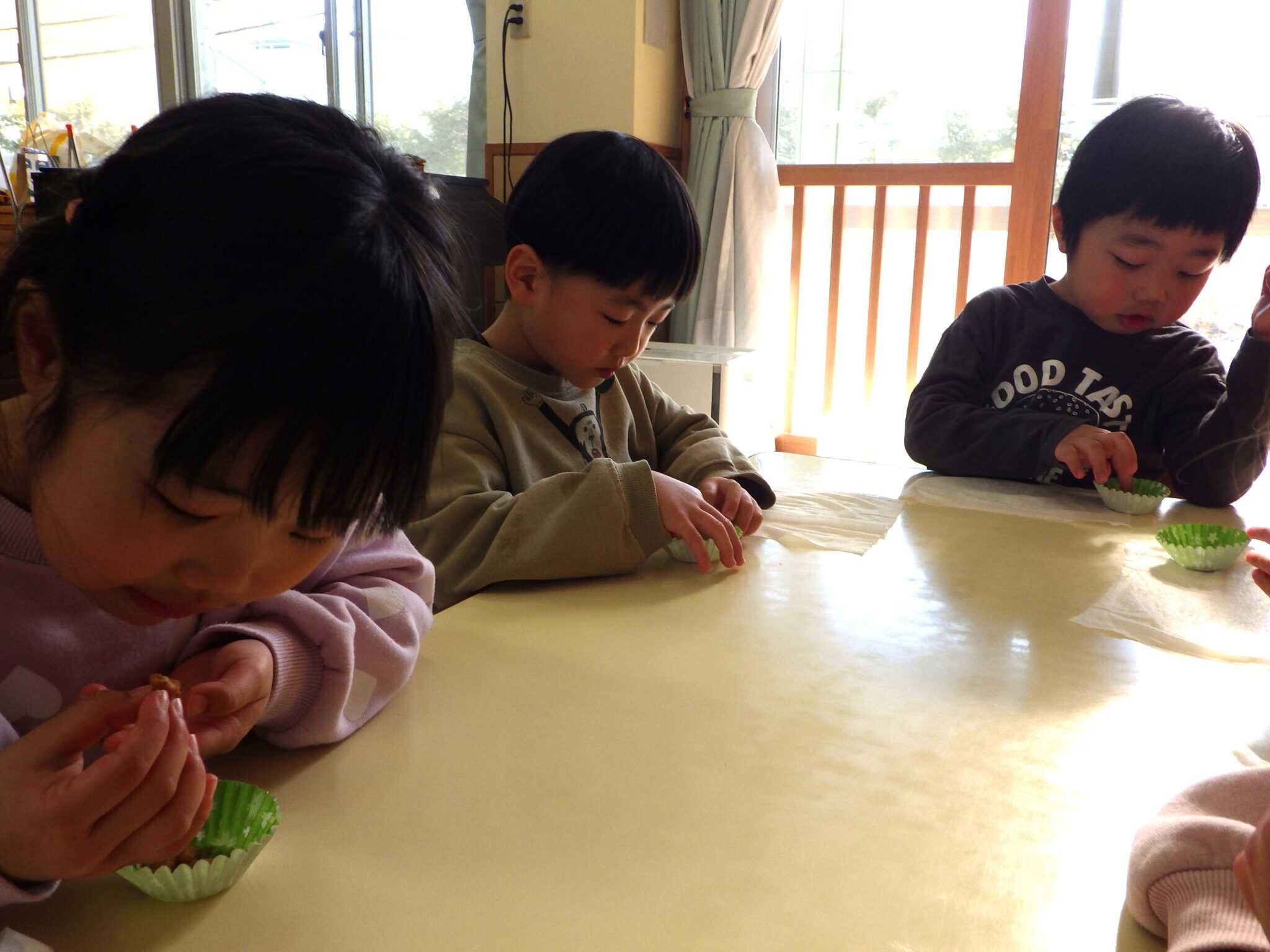 大きいクラスの子どもたちは、ふっくら炊いたきなこ大豆を皆でいただきました♪