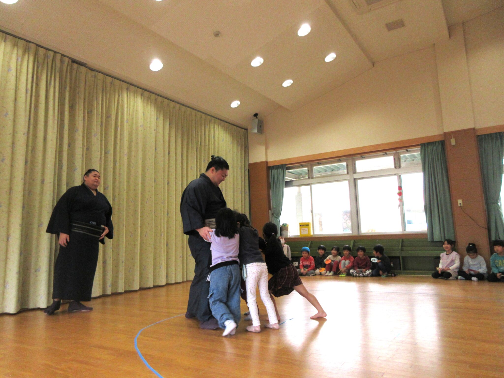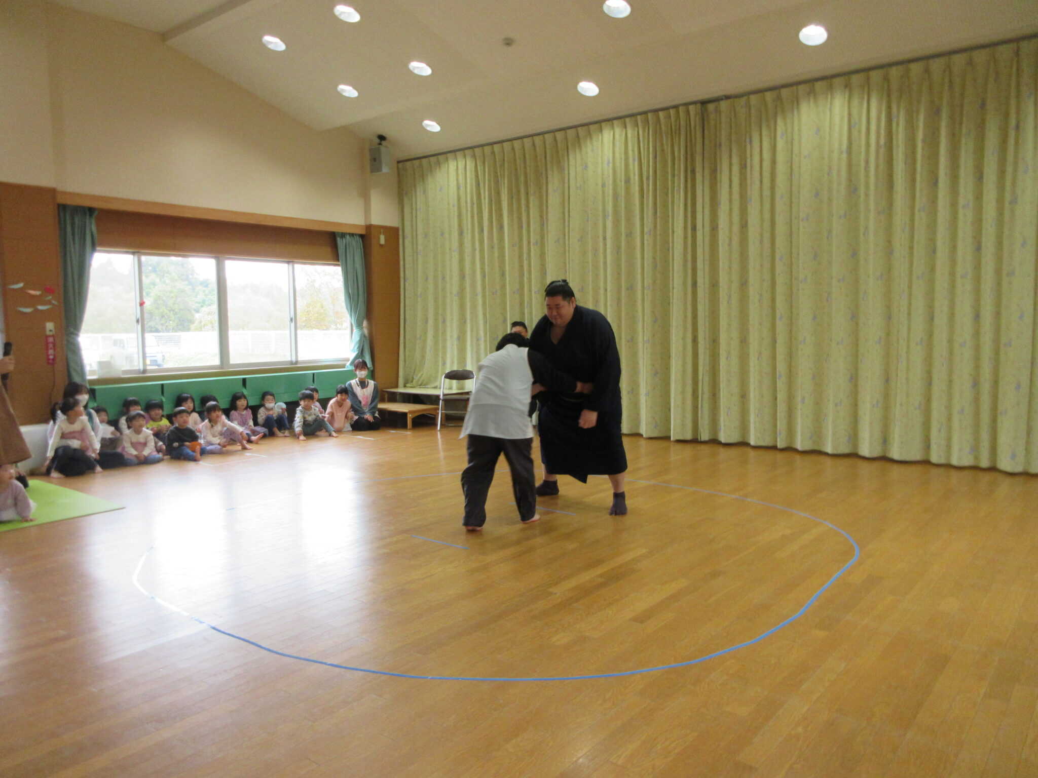 限られた時間だったのですが、ぞう組(年長児)の子どもたち4~5人とぶつかり稽古をしてくださいました!