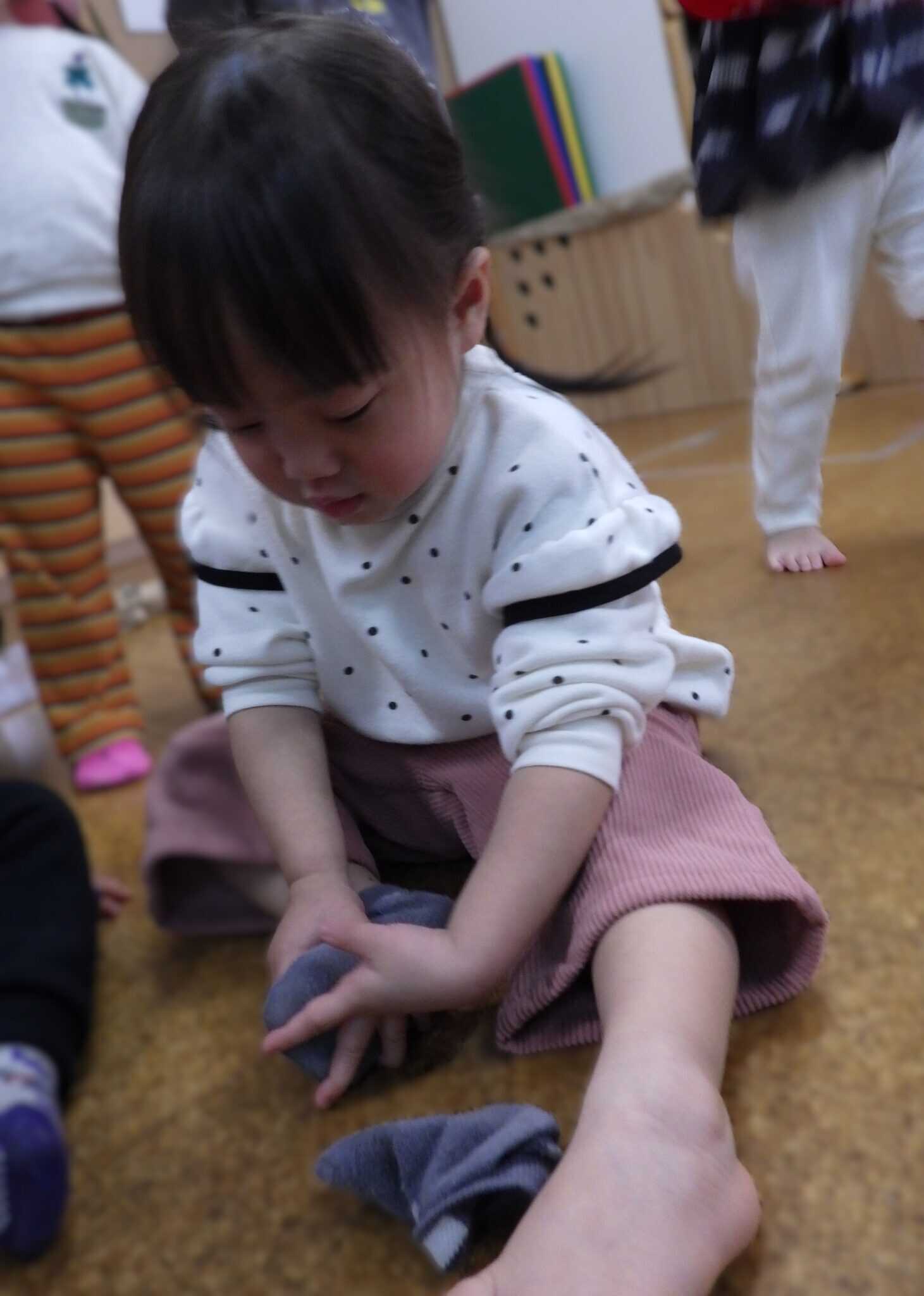 戸外遊びが楽しみで、一人で一生懸命に靴下をはこうとする姿✨