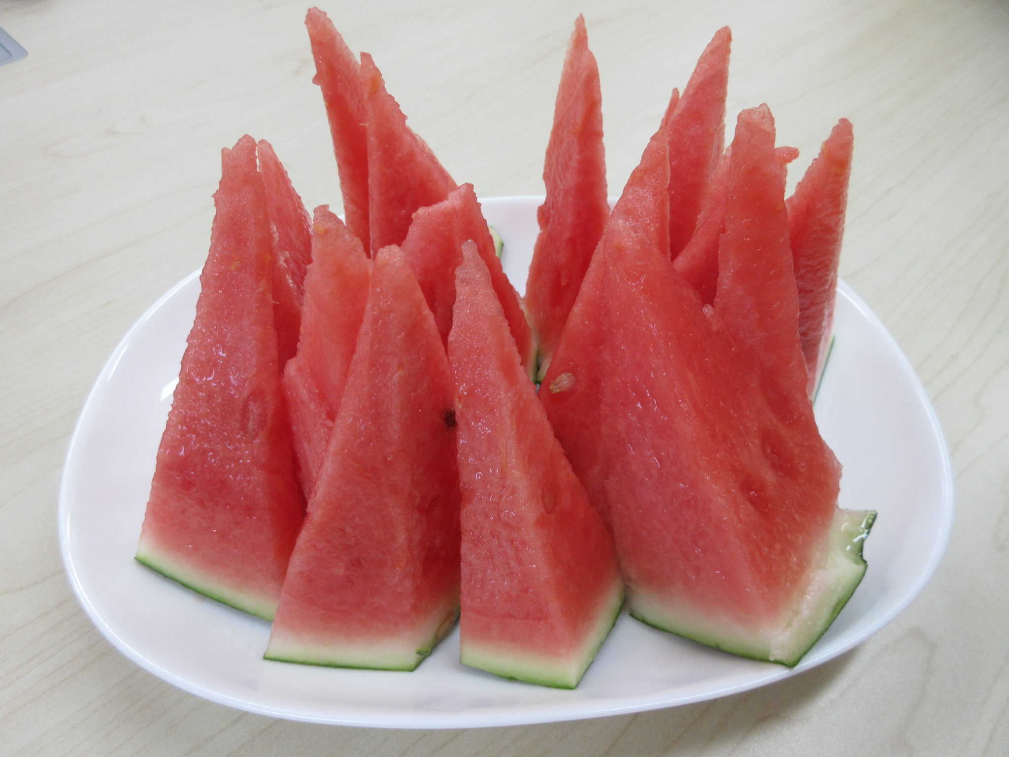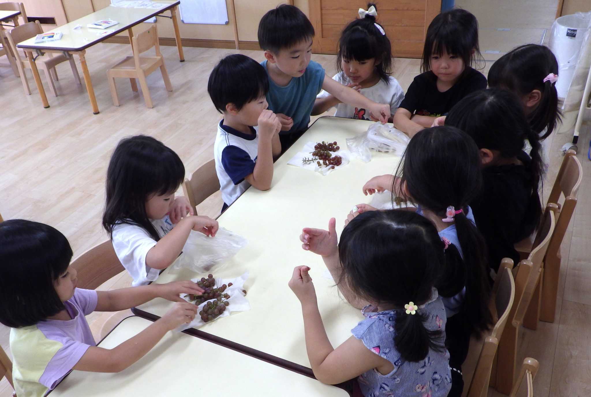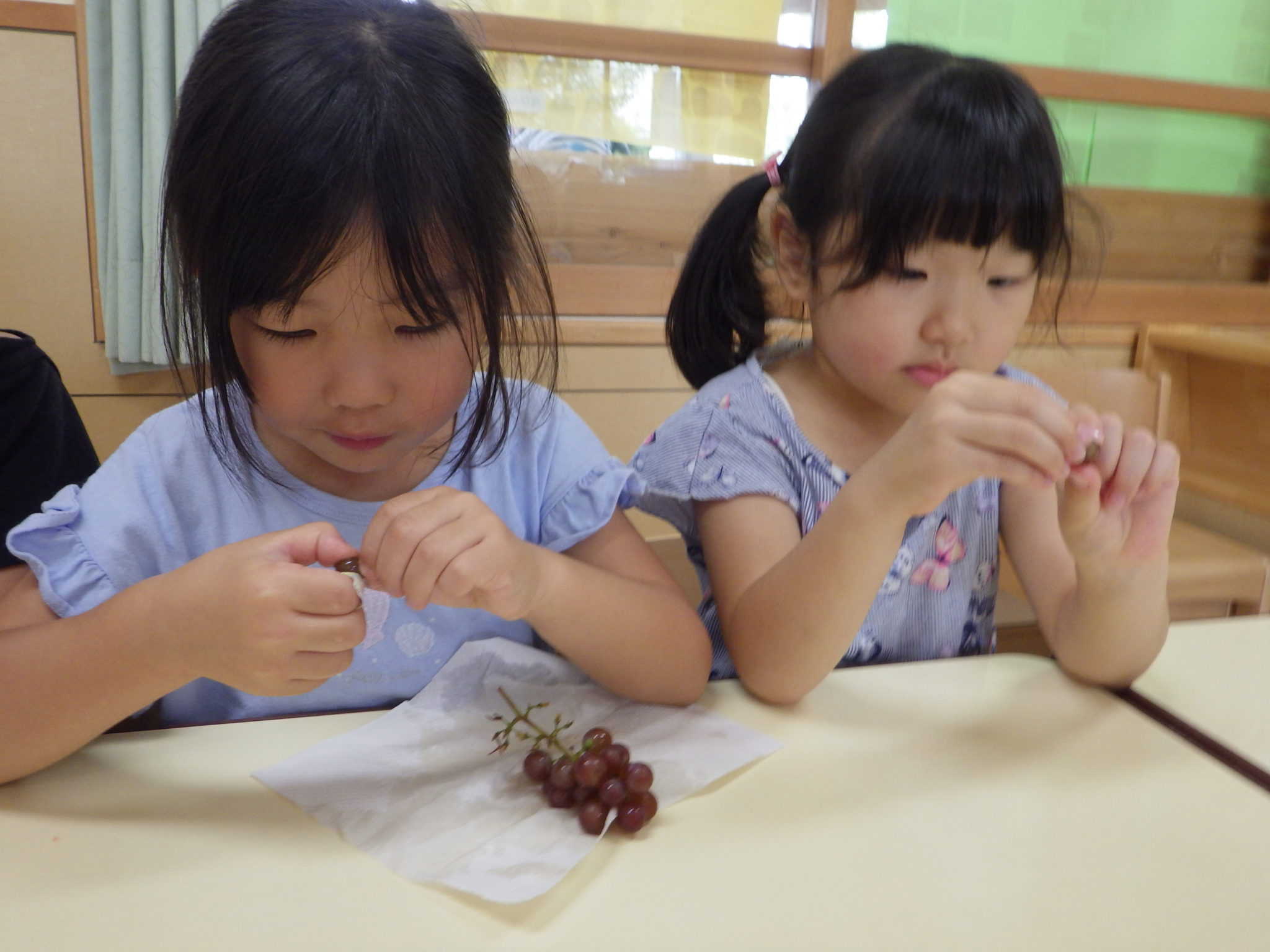 (誤嚥の心配が無いように、口の中で種を取り出し安全に食べられるように促しています。小さいクラスの子は食べていません)