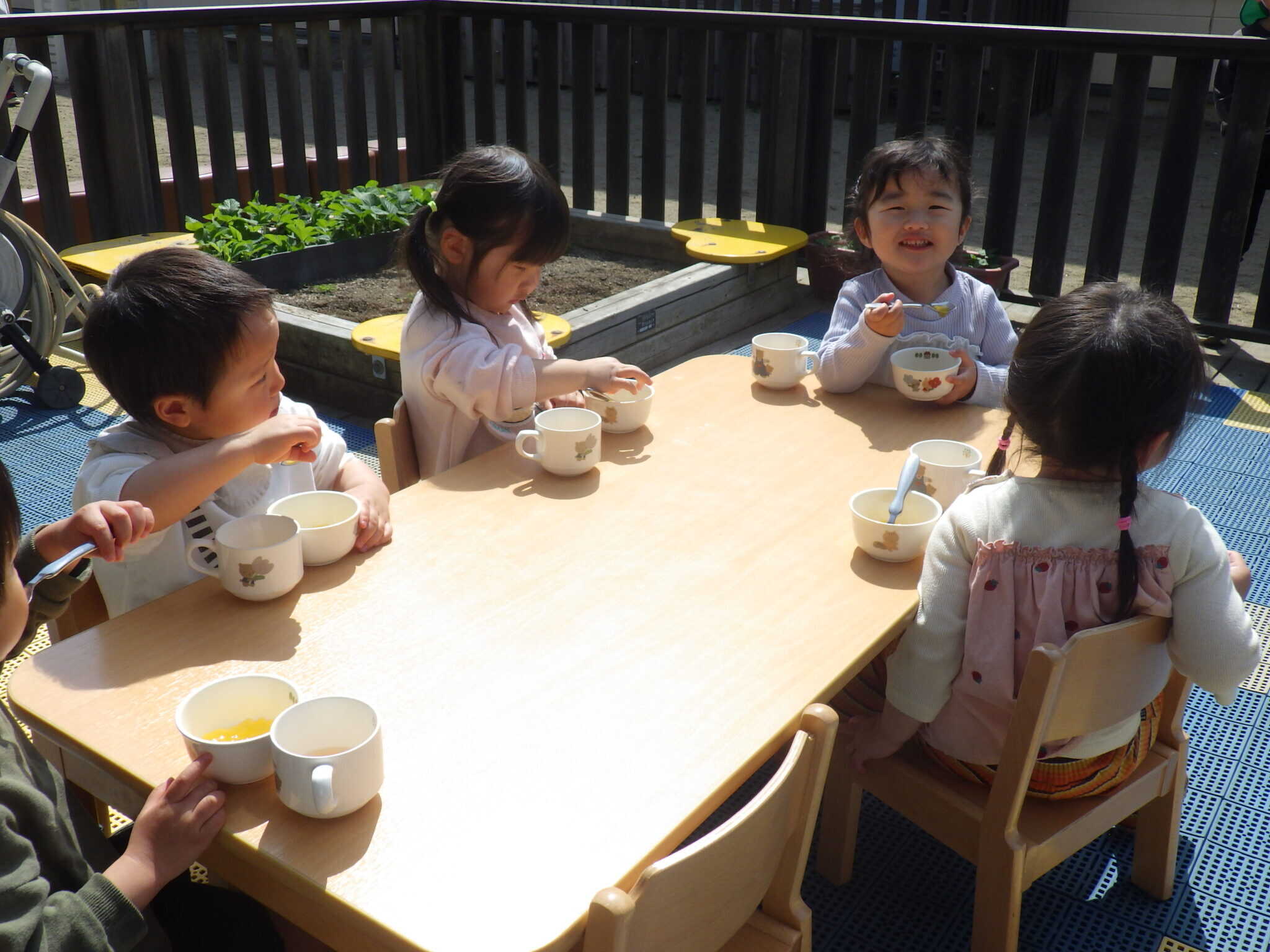 うさぎ組(2歳児)さんはテラスでおやつタイム!