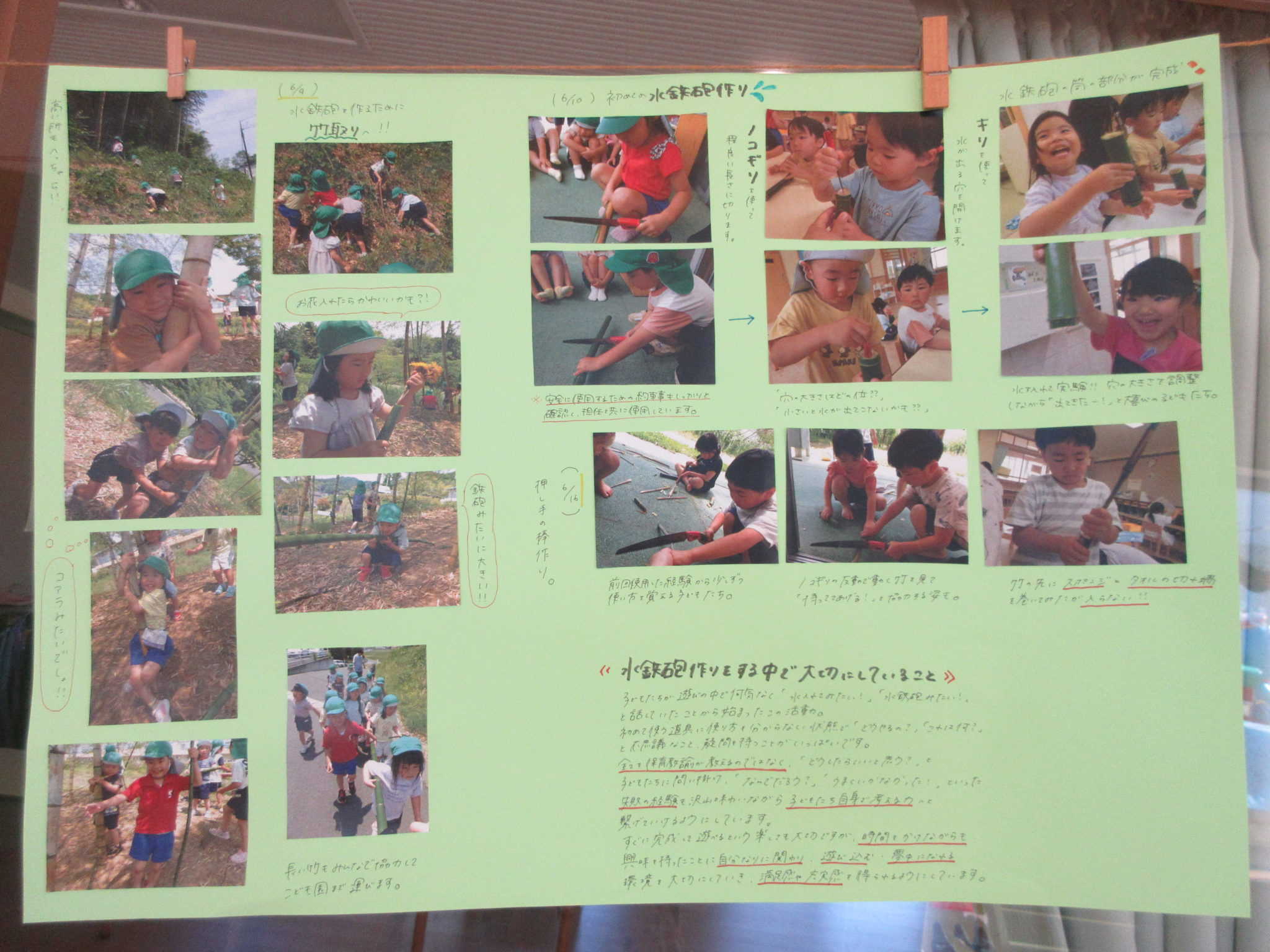 「何か作りたい!」との事で、切ったり叩いたり、砕いてみたり(やわらかい竹は簡単に砕けます…)、試行錯誤しながら、竹のかたちを様々に変化させ楽しむ中で、水鉄砲づくりが始まりました!