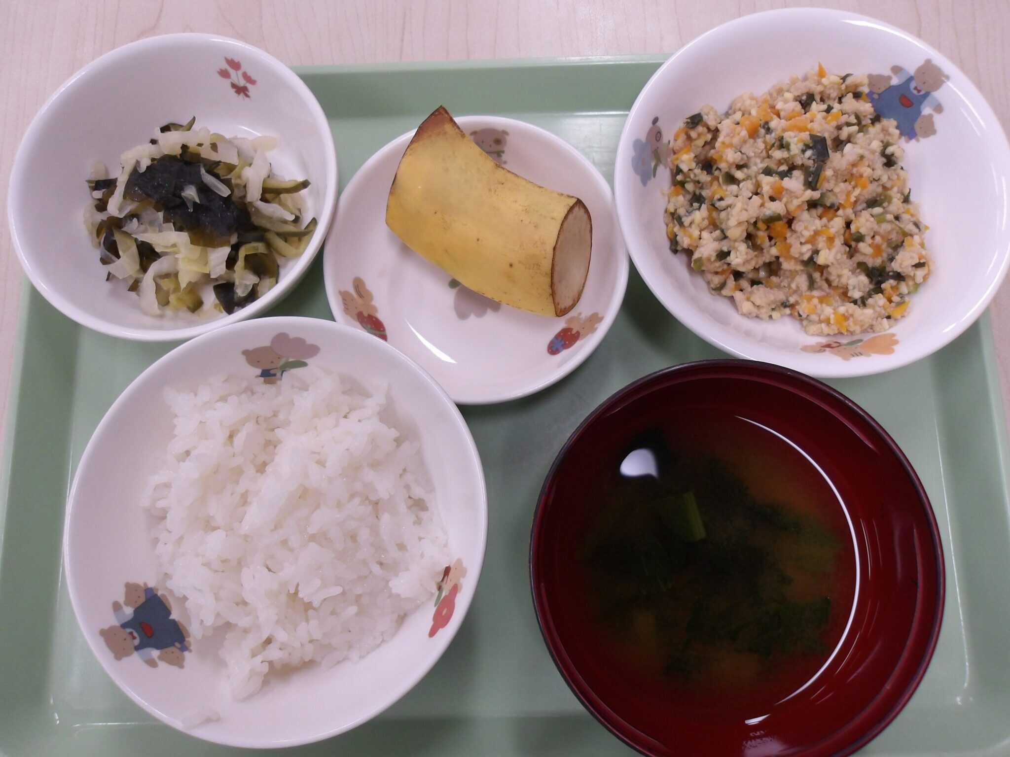 レストランこの日は、県民防災の日で、備蓄の防災食「わかめごはん」を食べました。大きいクラスの子どもたちは、実際に防災食を自分たちで作りましたよ。