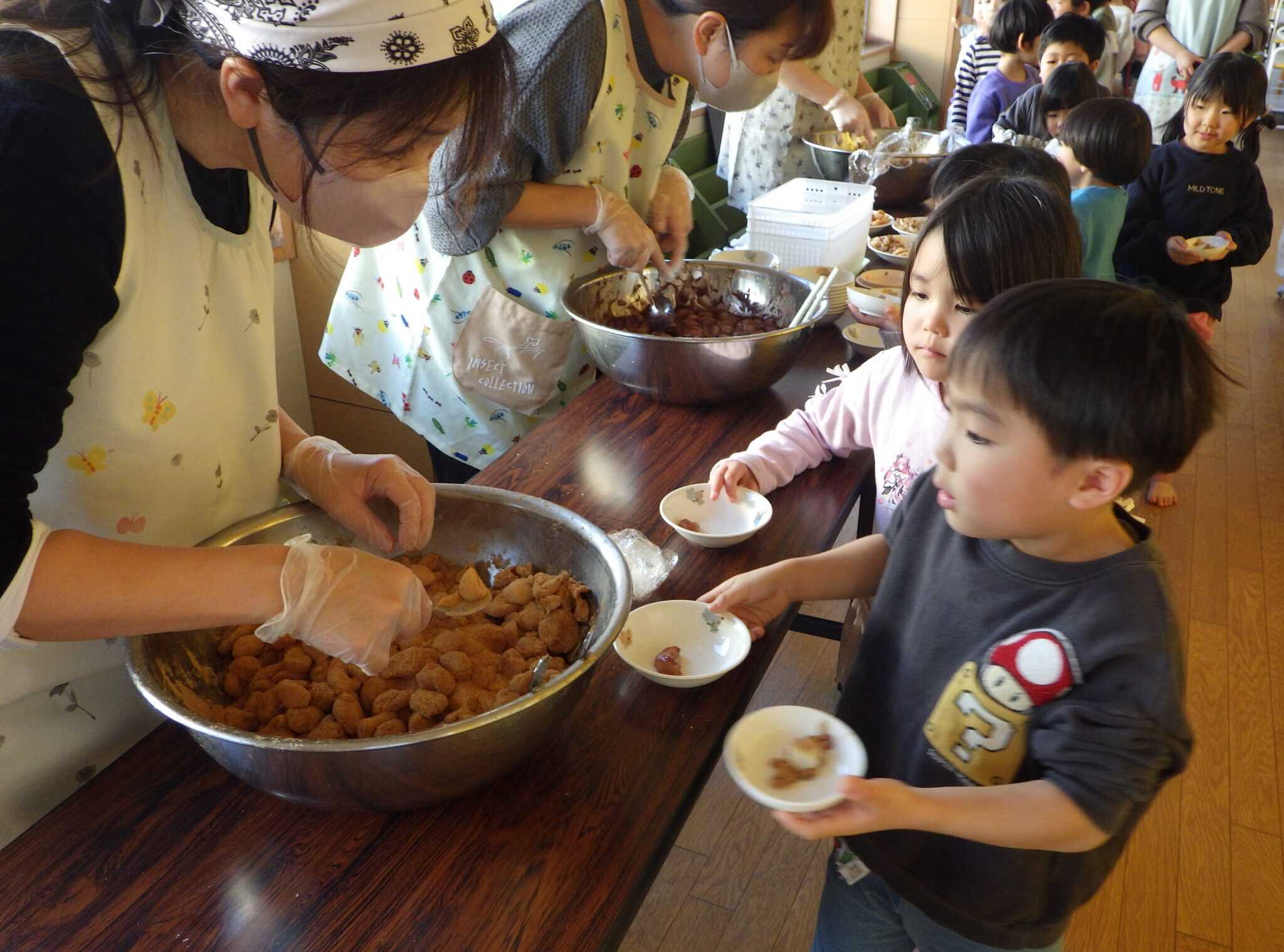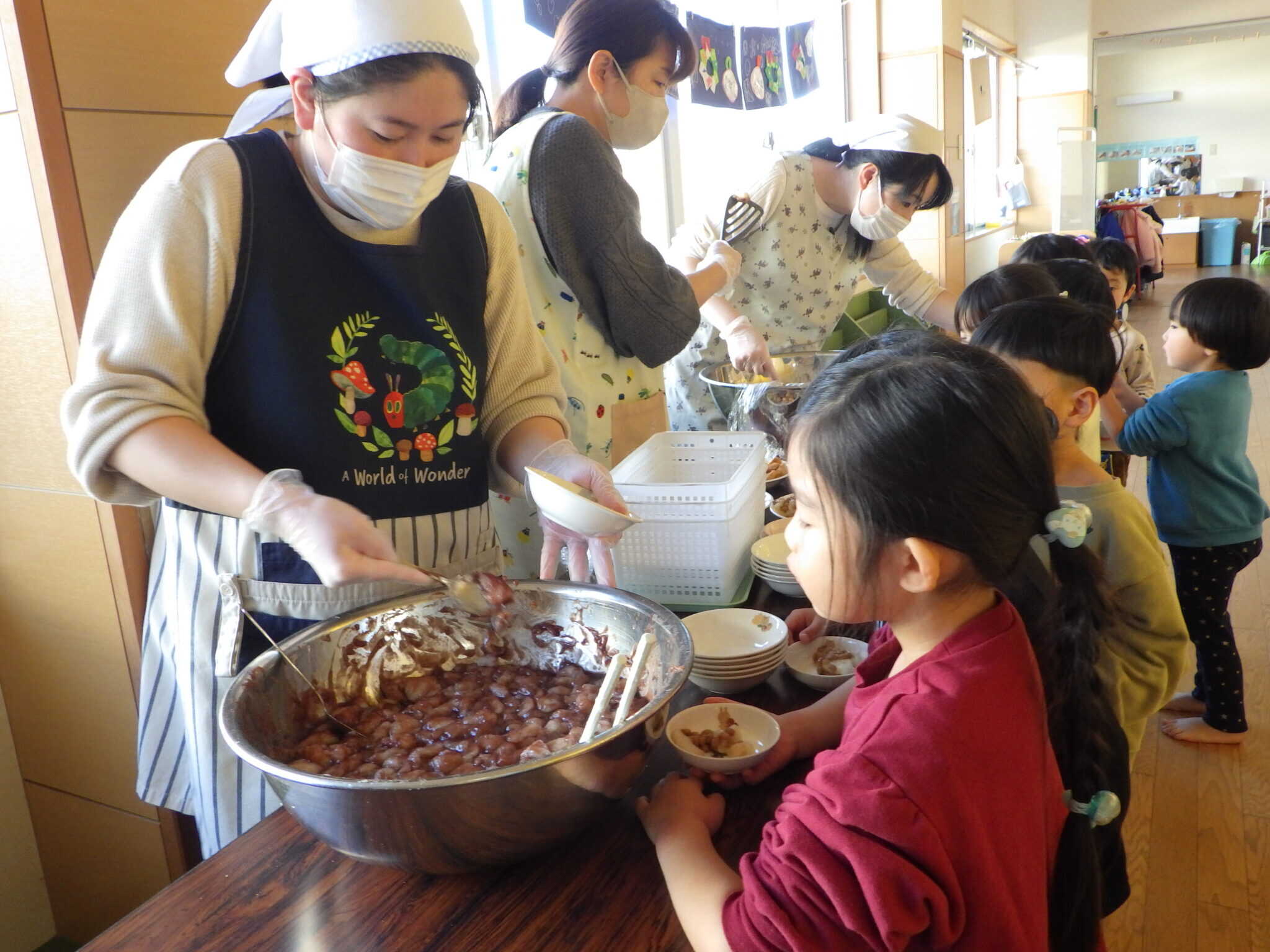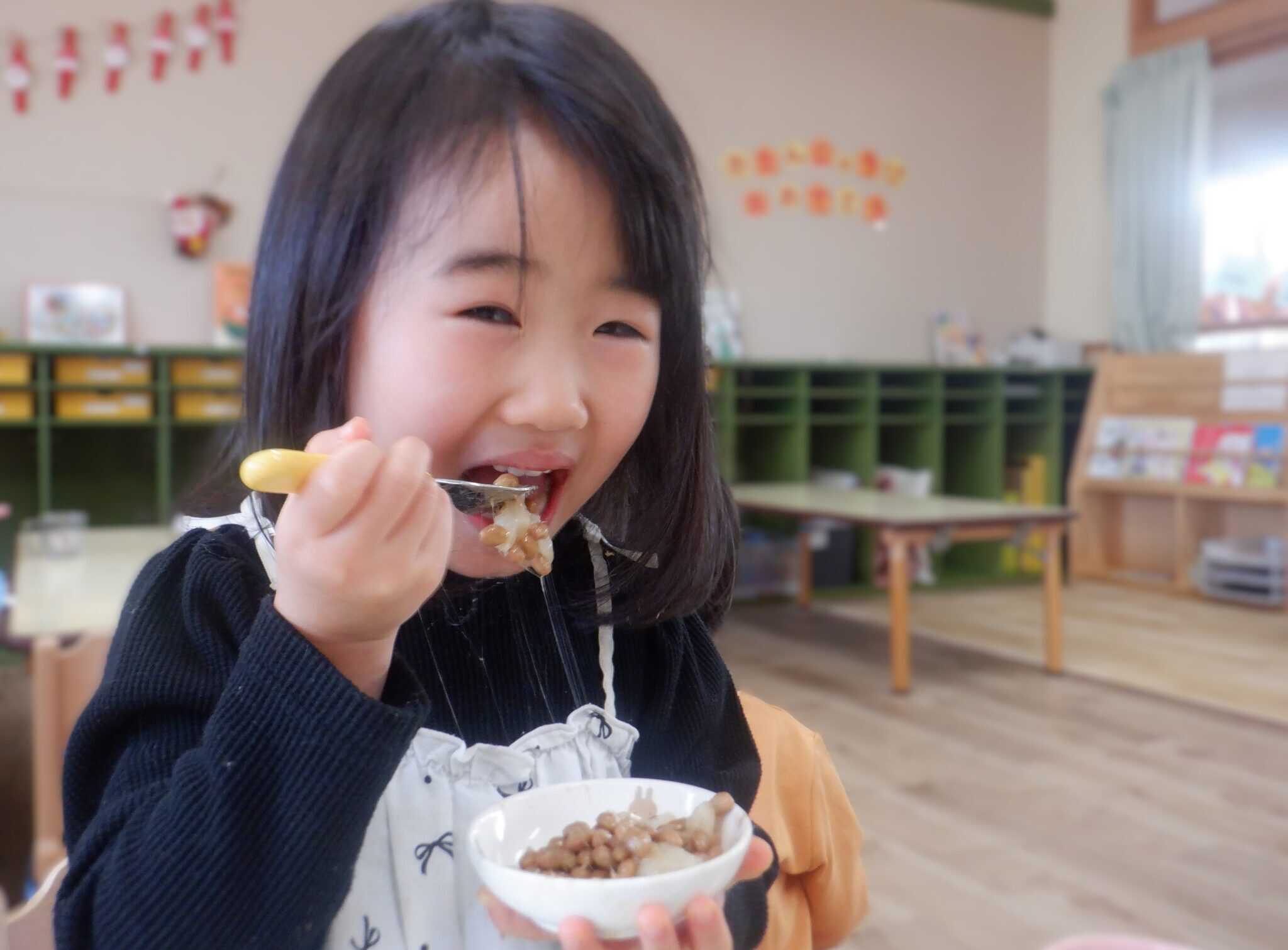 *小さいクラスの子どもたちは、納豆ごはんを提供しました。(餅の提供は、ありません)