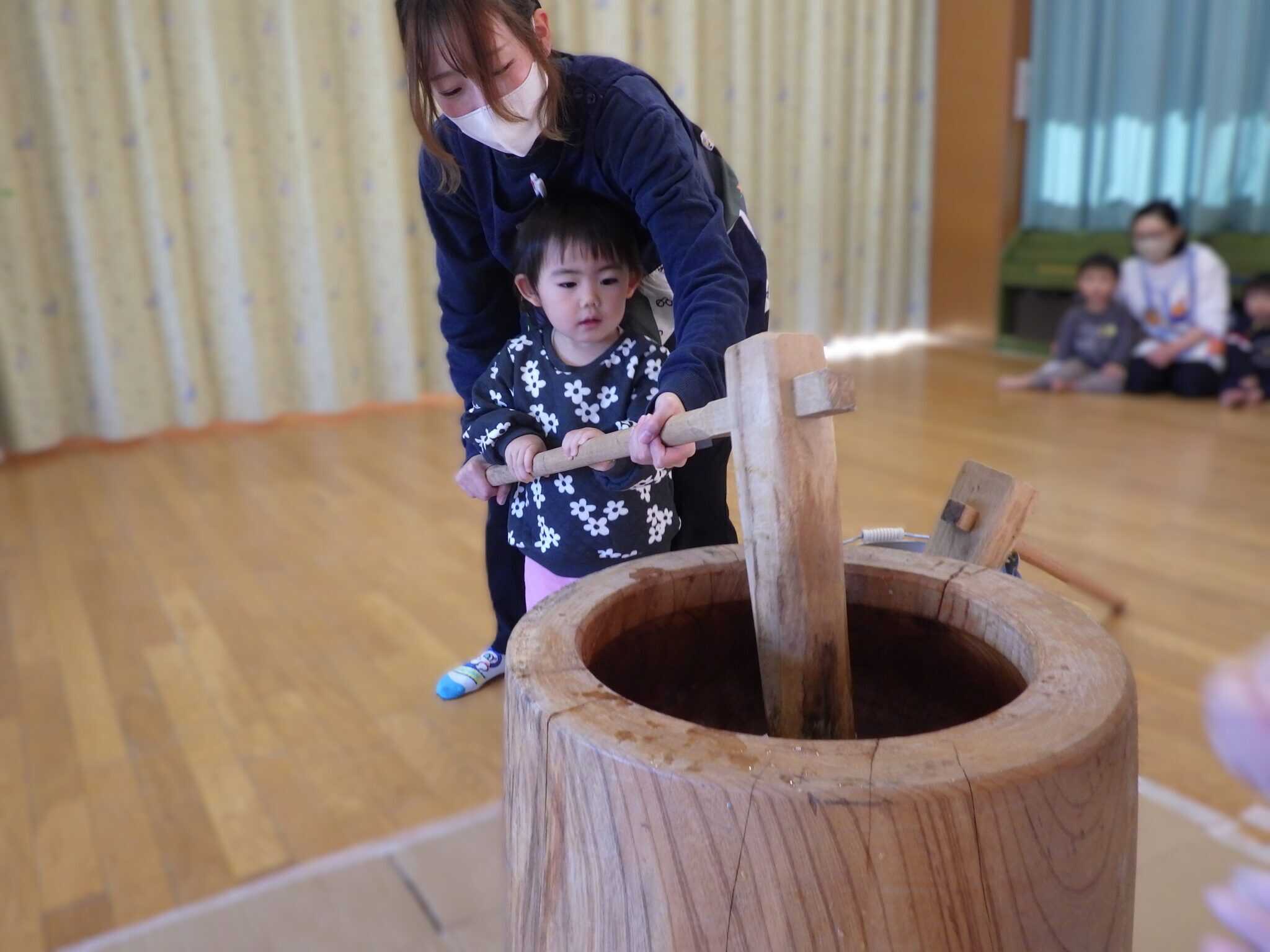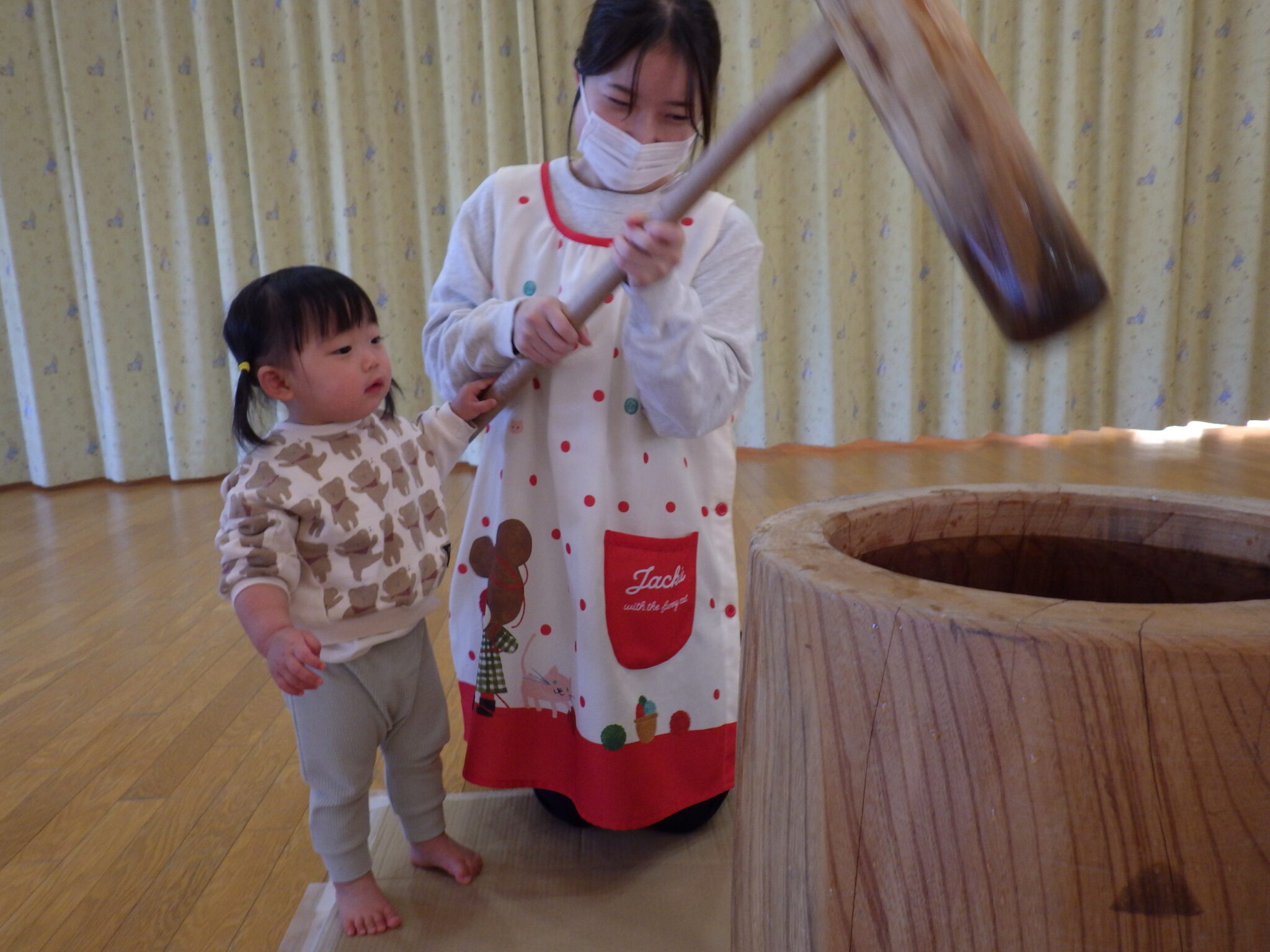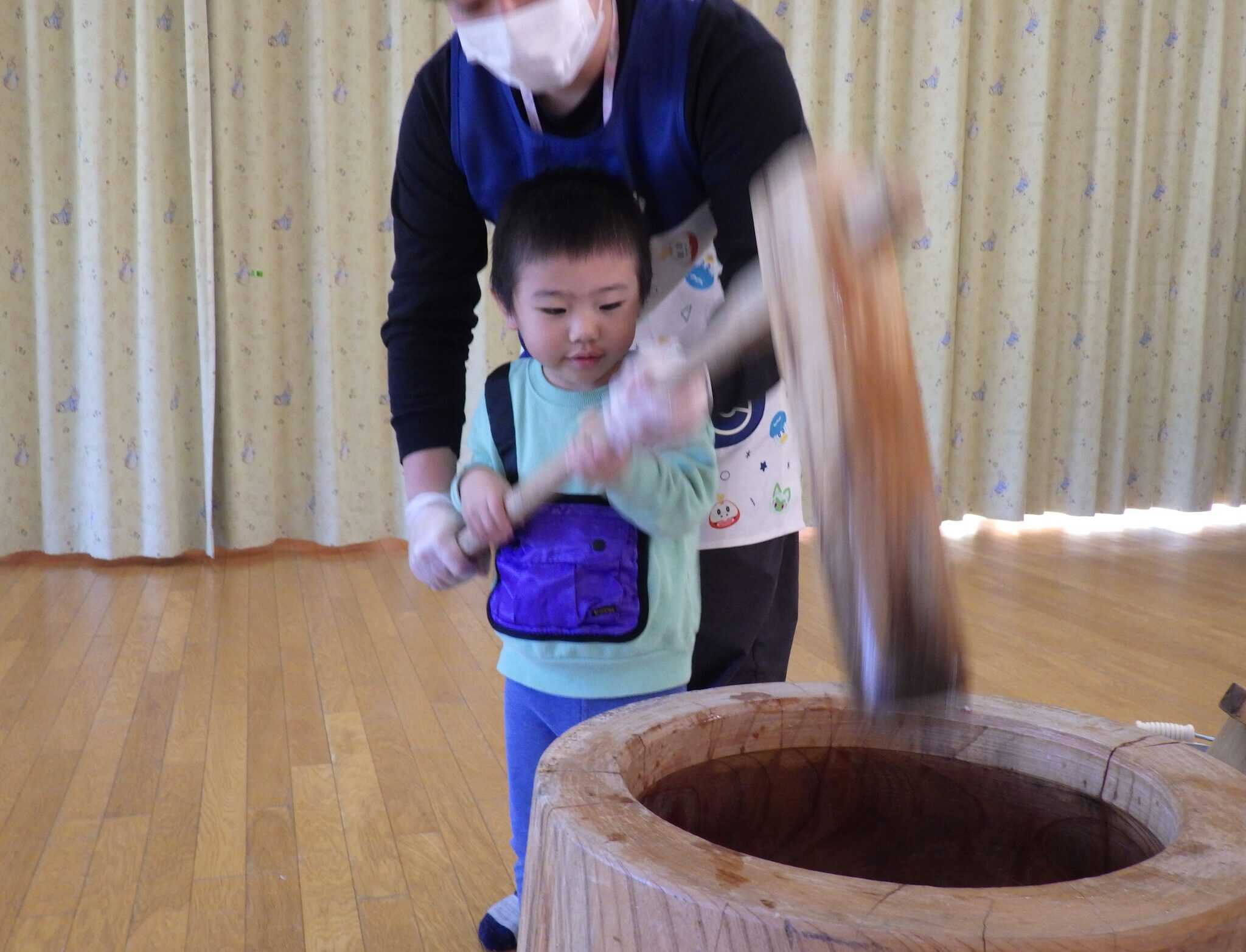 小さいお友達も杵と臼でお餅つき(*^-^*)