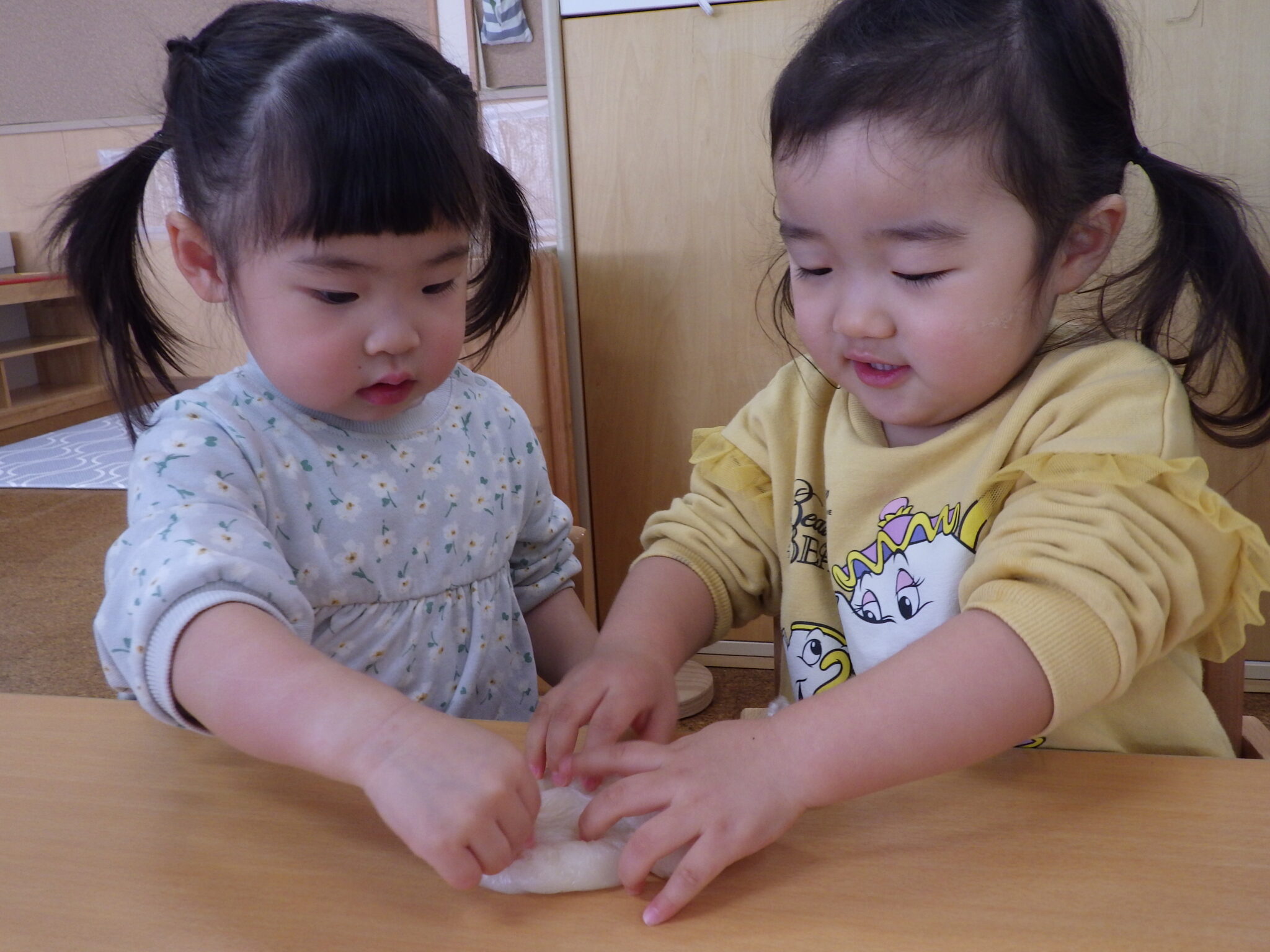 小さいクラスの子どもたちは、感触でお餅を楽しみました✨